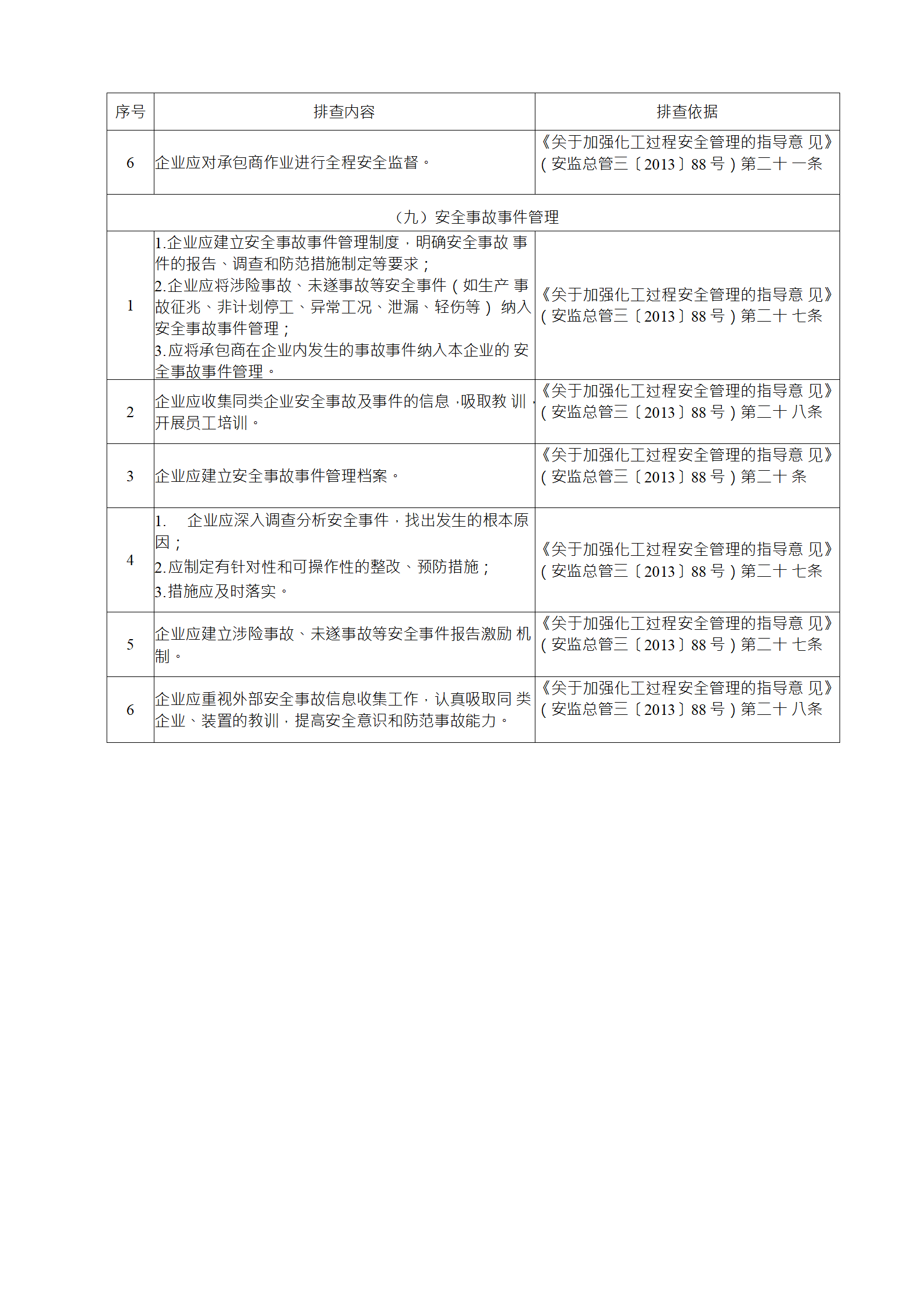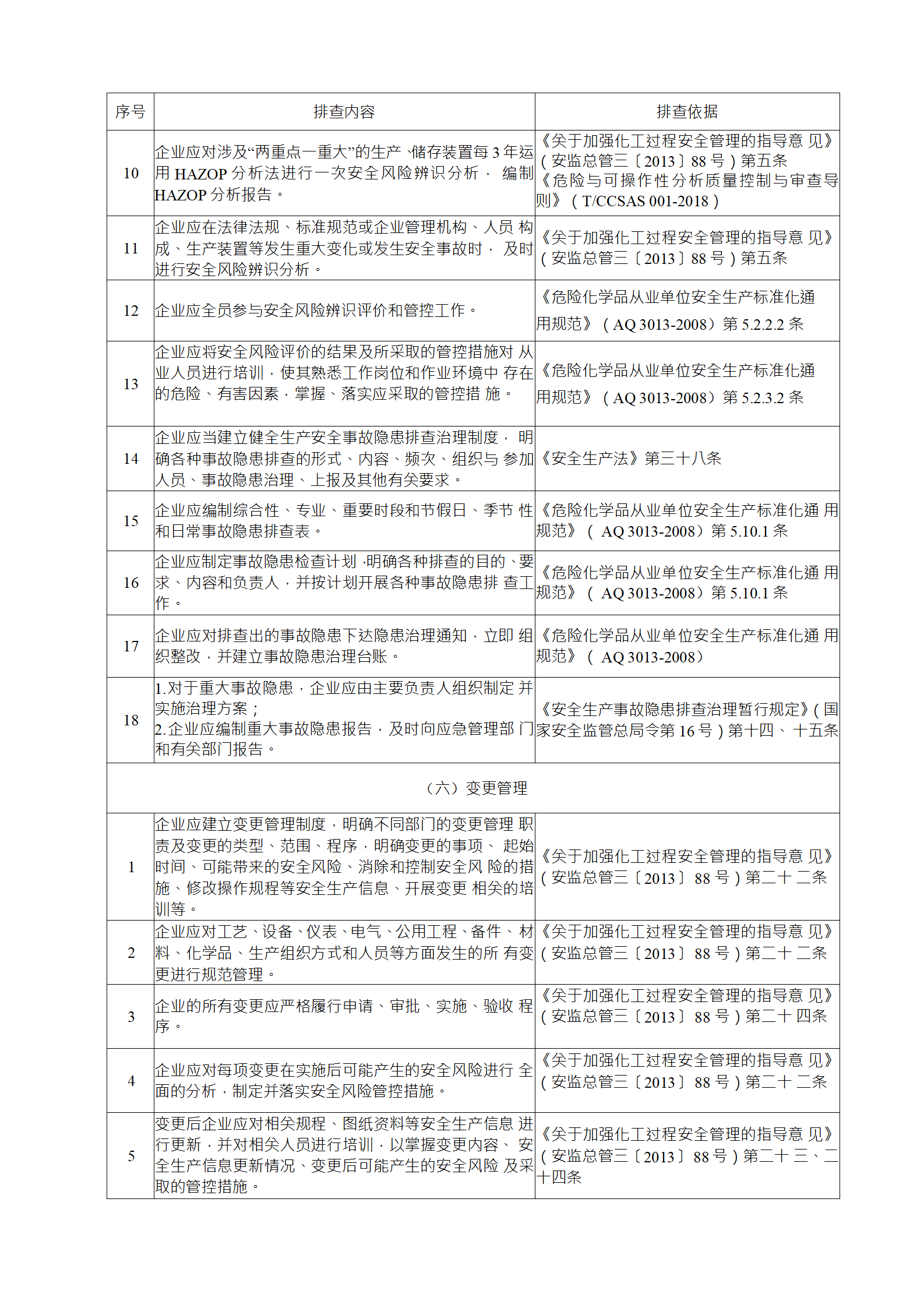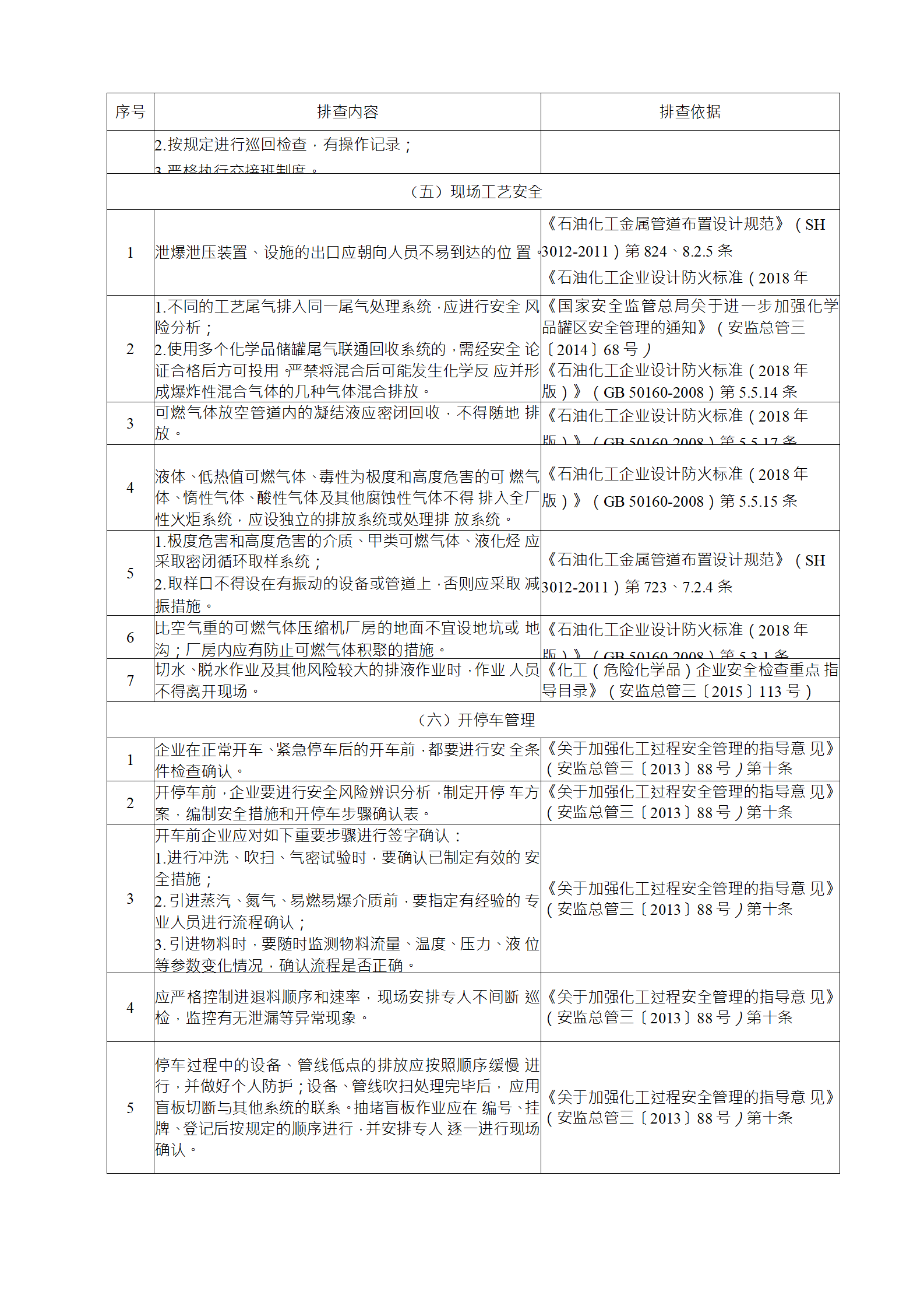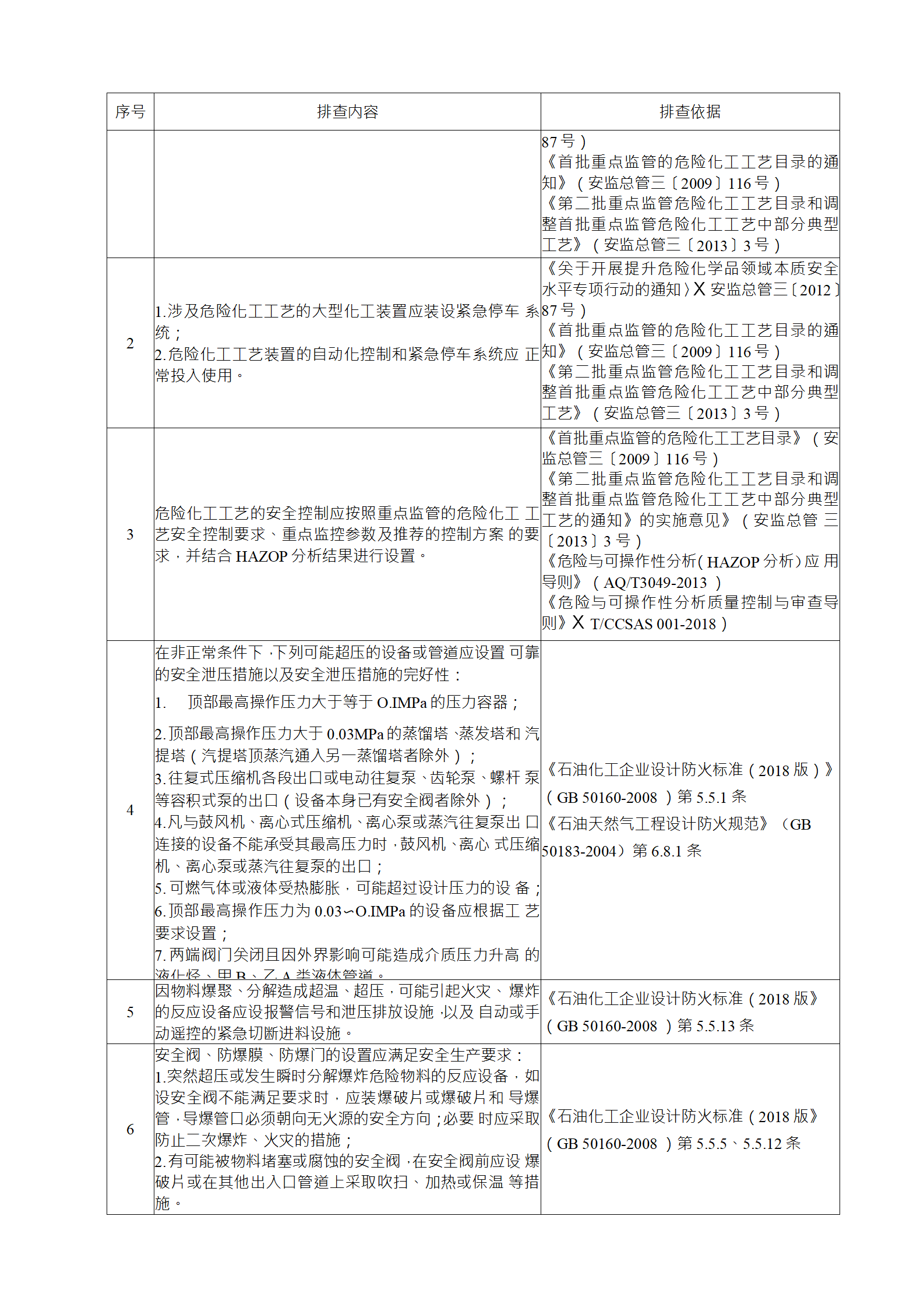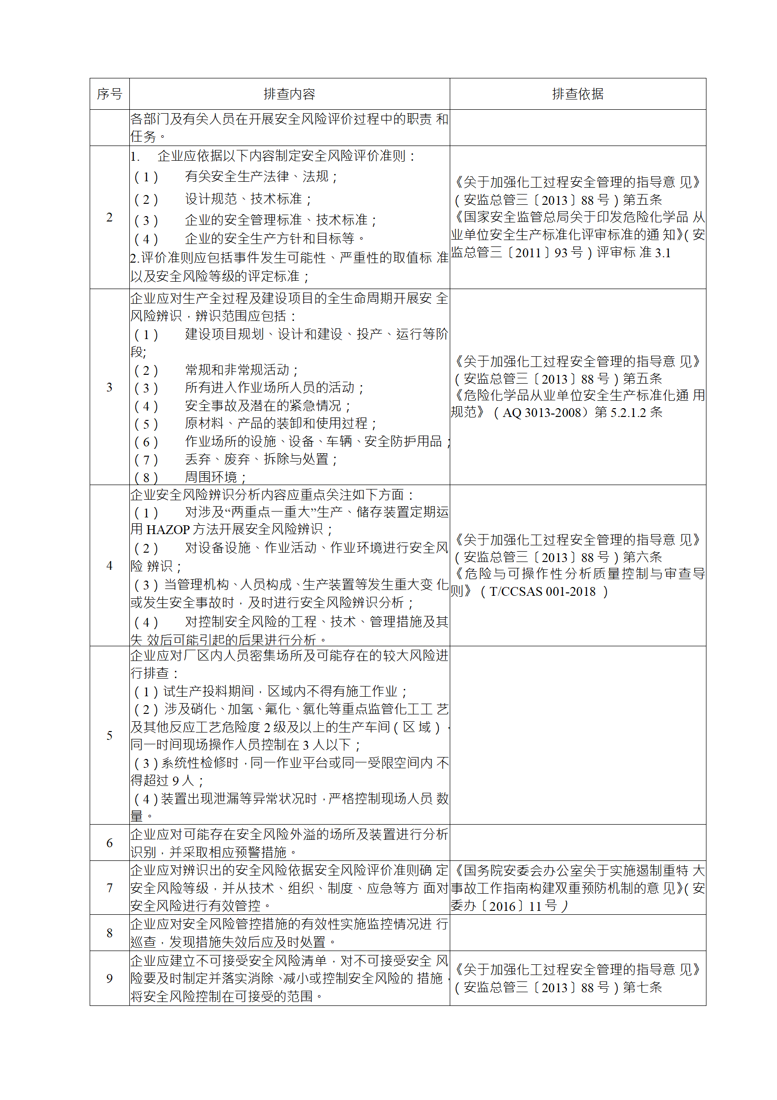 企業(yè)應(yīng)結(jié)合自身安全風(fēng)險及管控水平,按照化工過程安全 管理的要求,參照各專業(yè)安全風(fēng)險隱患排查表(見附件),編制 符合自身實(shí)際的安全風(fēng)險隱患排查表,開展安全風(fēng)險隱患排查 工作。