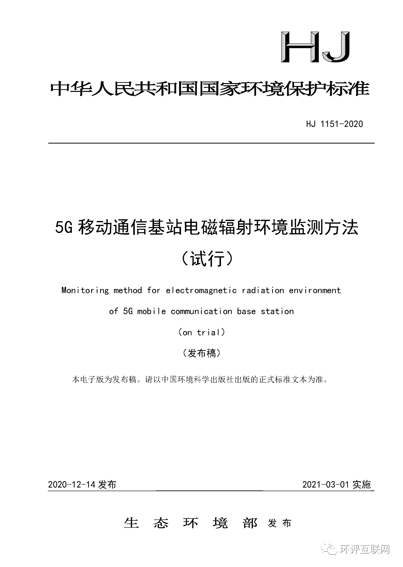 一、《5G移動通信基站電磁輻射環(huán)境監(jiān)測方法(試行)》(HJ 1151-2020)