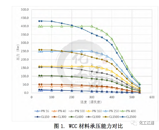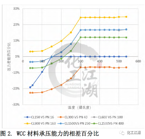 本文采用了對比冷(常溫)工作壓的方法來近似推算出與ASME標準Class壓力等級最鄰近的EN標準PN壓力等級。EN12516-1標準中列出的所有材料的冷工作壓都是相同的。而ASME B16.34標準中列出的冷工作壓和材料相關(guān),故選取了其中一種較強材料(C12A)的冷工作壓用于對比。 通過對比得到每個ASME標準 Class壓力等級對應的最鄰近的EN標準 PN壓力等級,見表1。同時,這樣的對應關(guān)系也和閥門設計的通用做法一致。本文的管道內(nèi)徑,最小壁厚,材料承壓能力的對比都是依照表1中的對應關(guān)系來進行的。 1.2 材質(zhì)承壓能力的對比 無論是ASME標準還是EN標準都列出了一些ASTM標準材料的壓力溫度等級,即材料在不同溫度下的承壓能力。本文選取了常見的閥體材料:碳鋼WCC,合金鋼 WC9和C12A進行研究,來對比兩個標準中相同材料在標準壓力等級下的承壓能力的差別。 圖1和圖 2顯示了WCC材料的溫度壓力曲線和Class與PN的對比,可以看出: (1)對于ASME的 Class 150和EN12516-1 的PN16,當溫度低于150攝氏度時,EN標準規(guī)定的材料承壓能力低于ASME標準規(guī)定的材料承壓能力,且隨著溫度升高,差距逐漸縮小。當溫度高于150攝氏度時,兩個標準對相同材料的承壓能力的規(guī)定近乎相同。 (2)對于ASME的 Class 300和EN12516-1 的PN40,在整個溫度的范圍內(nèi),EN標準規(guī)定的材料承壓能力均低于ASME標準規(guī)定的材料承壓能力。當溫度低于300攝氏度時,隨著溫度升高,差距逐漸縮小。當溫度高于300攝氏度時,兩個標準對相同材料的承壓能力的規(guī)定差別趨于一致,約為-7%。 (3)對于ASME的 Class 900和EN12516-1 的PN160, 在整個溫度的范圍內(nèi),EN標準規(guī)定的材料承壓能力均高于ASME標準規(guī)定的材料承壓能力。當溫度低于300攝氏度時,隨著溫度升高,差距越來越大。當溫度高于300攝氏度時,兩個標準對相同材料的承壓能力的規(guī)定差別趨于一致,約為24%。 (4)還有一點值得注意的,除了PN16,其他PN壓力等級對應的工作壓力在低于300攝氏度以下都是一樣的,而ASME等級對應的工作壓力是隨著溫度升高持續(xù)下降的。 1.3 對閥體設計的指導 在實際設計過程中,無論是為了縮短新產(chǎn)品推向市場的時間,還是從產(chǎn)品標準化、成本優(yōu)化的角度去考慮,盡可能多地將已有的設計或者零部件(尤其是需要開發(fā)鑄造模具的閥體)應用到新的產(chǎn)品中,都是設計師不可避免要考慮的問題,可以采用同一個閥體鑄件的設計來滿足ASME 標準和EN標準的要求呢?為了解答這個問題,本文選取了三個不同壓力等級-低、中、高的十二個具體實例,各項參數(shù)的對比結(jié)果如表3 所示。 (1)低壓ASME Class 300與 EN PN40 從表3中差別的百分數(shù)可以看出,在兩個尺寸下,滿足ASME標準和EN 標準的管道內(nèi)徑和最小壁厚的差別,均小于5%。就是說,用同一個閥體設計來滿足兩個標準的設計要求是可以接受的。同時從圖2中可以看出,閥體常見材料在這兩個等級的承壓能力差別也較小,10%以內(nèi)。因此,兩個設計可以在類似的實際工況中應用。 (2)中壓ASME Class 900與 EN PN160 對于中壓下尺寸為DN100和DN200的兩組設計,從差別的百分數(shù)可以看出,雖然每組中要對比的兩個設計的管道內(nèi)徑非常接近,但是所要求的最小壁厚卻相差較多,超過了20%。在這種情況下,實踐中也是可以用同一個閥體設計來滿足兩個標準的設計要求的,但是需要評估由此帶來的對最小壁厚要求較小的閥體的成本的影響。另一方面,從圖2中可以看出,閥體常見材料在這兩個等級的承壓能力差別較大,在有些溫度下差別達到20%。這種材料承壓能力上的差別和最小壁厚的差別是一致的。 (3)高壓ASME Class 2500與EN PN400 對于高壓下尺寸為DN100和DN200,閥門的管道內(nèi)徑和最小壁厚存在著巨大差別,30%-50%,故采用同一個閥體設計來滿足兩個標準的設計要求是不合理的。 還有另外一個因素需要在閥體設計時考慮,那就是閥體兩個端口之間的長度。ASME B16.34中指出可以按照ASME B16.10來確定端口對端口尺寸。EN12516-1 并未提及端口對端口尺寸,但歐標體系中EN558規(guī)定了端口對端口的尺寸。考慮到端口對端口尺寸并非標準強制要求,故本文未提供ASME B16.10和EN558的區(qū)別。 (1)管道內(nèi)徑 ASME標準和EN標準在管道內(nèi)徑的主要差別在于管道內(nèi)徑是否隨著壓力等級的變化而變化。閥體設計時,管道內(nèi)徑的差異會進一步放大閥門最小壁厚的差異。 (2)最小壁厚 兩個標準在閥門最小壁厚上的差異與壓力等級有關(guān),差別大致在6%到 26%之間。 (3)材料承壓能力 本文所研究的五種材料在兩個標準相鄰壓力等級間的對比趨勢類似。當溫度高于一定值時,兩個標準對相同材料的承壓能力的規(guī)定的差別趨于一致,但不同的壓力等級的差別大小不一。 (4)通過十二個實例驗算,發(fā)現(xiàn)對于DN100和DN200, 同類設計壓力下,ASME標準和EN標準對管道內(nèi)徑和最小壁厚要求的差別非常接近。并解釋了在實際設計工作中,需要根據(jù)具體的閥門尺寸,壓力等級一一比較管道內(nèi)徑和最小壁厚等設計參數(shù),并考慮到時間和成本的平衡,才能做出合理的決定。
