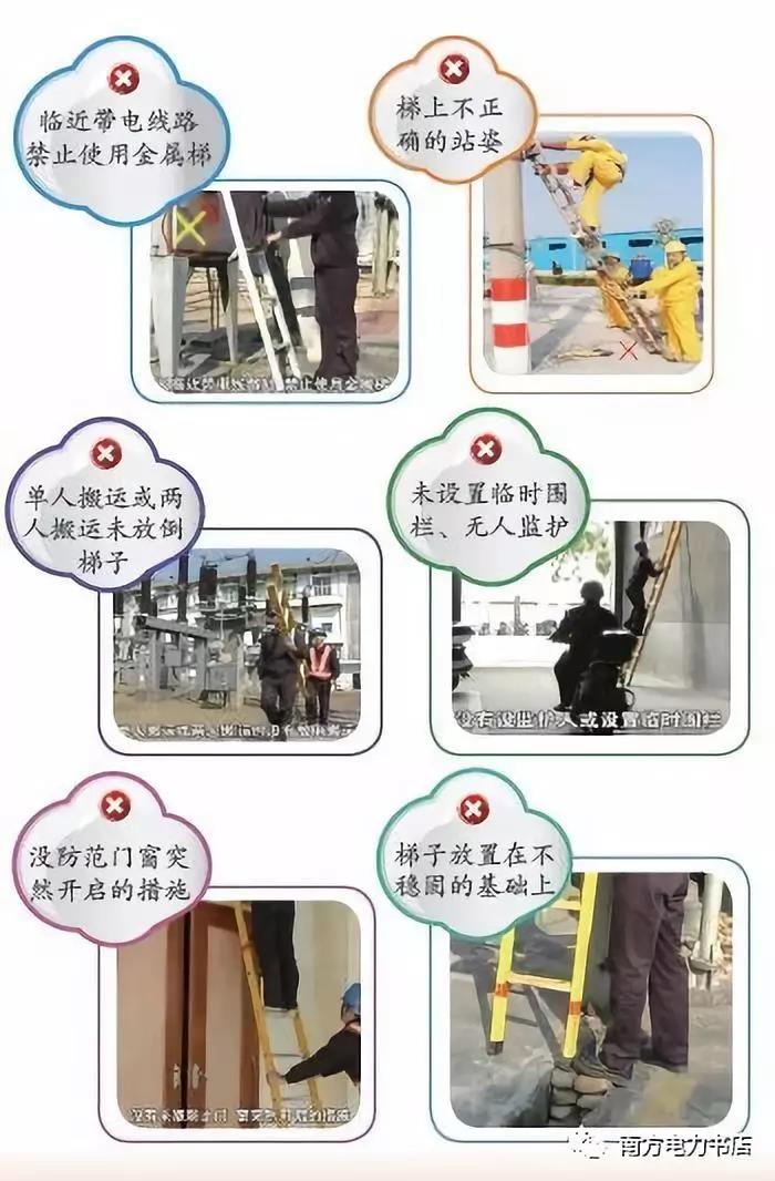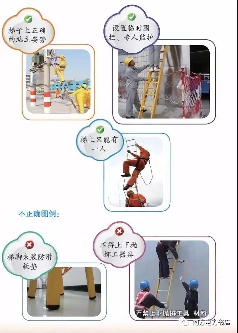 (3)硬質(zhì)梯子的橫檔應(yīng)嵌在支柱上, 梯階的距離不應(yīng)大于40cm,并在距梯頂1m處設(shè)限高標(biāo)志??吭诠茏由?、導(dǎo)線上使用梯子時(shí),其上端需用掛鉤掛住或用繩索綁牢;伸縮梯調(diào)整長(zhǎng)度后,要檢查防下滑鐵卡是否到位起作用,并系好防滑繩,梯角沒(méi)有防滑裝置或防滑裝置破損、折梯沒(méi)有限制開(kāi)度的撐桿或拉鏈的嚴(yán)禁使用。