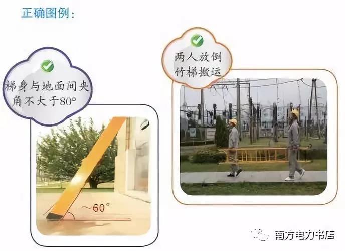 (6)在部分停電或不停電的作業(yè)環(huán)境下,應(yīng)使用絕緣梯。在帶電設(shè)備區(qū)域中,距離運(yùn)行設(shè)備較近時(shí),嚴(yán)禁使用金屬梯。在戶外變電站和高壓室內(nèi)搬動(dòng)梯子、管子等長(zhǎng)物,應(yīng)兩人放倒搬運(yùn),并與帶電部分保持足夠的安全距離,以免人身觸電氣設(shè)備發(fā)生事故。