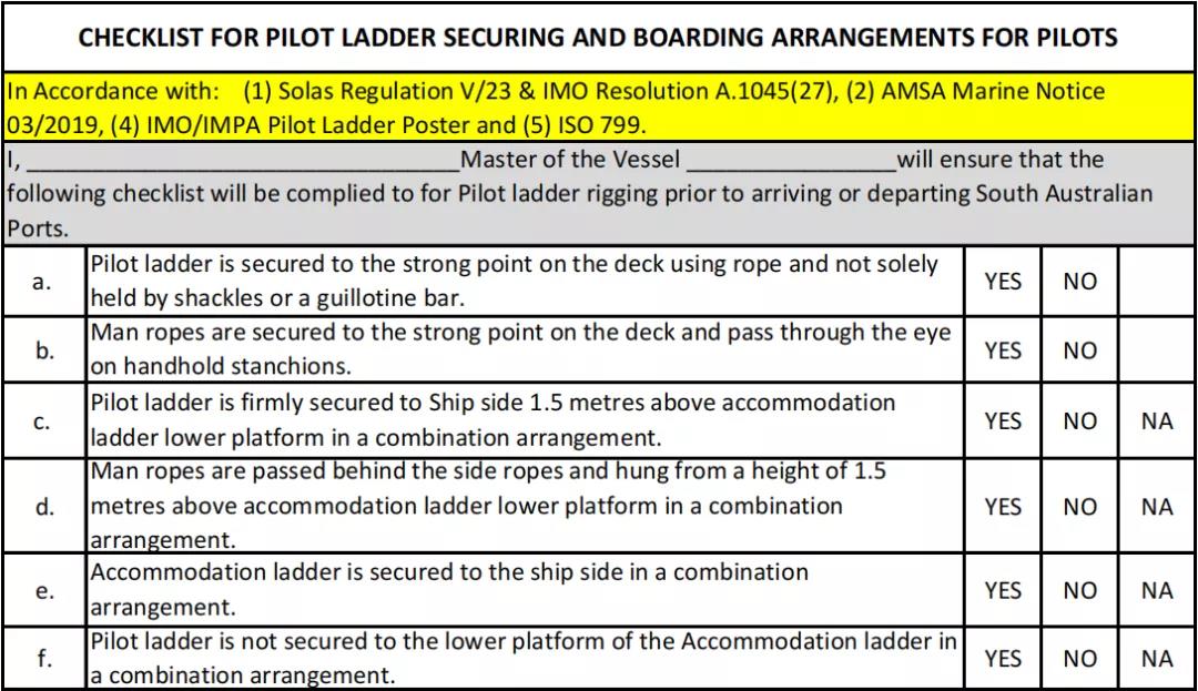 ·在抵達(dá)南澳大利亞港口之前,所有船長都應(yīng)填寫隨附的引航梯固定和登船安排清單。