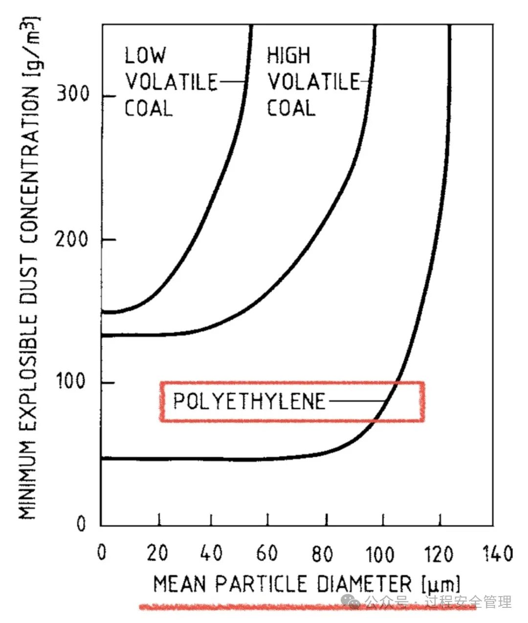 聚乙烯粉塵的粒徑小于90μm的情況下,最低爆炸濃度(MEC)大致為33g/m3,聚乙烯粉塵的粒徑大于120μm時,最低爆炸濃度(MEC)急劇升高,粉塵爆炸的可能性大幅降低。如果聚乙烯粉塵云濃度大于30g/m3,存在極大的粉塵爆炸風(fēng)險。