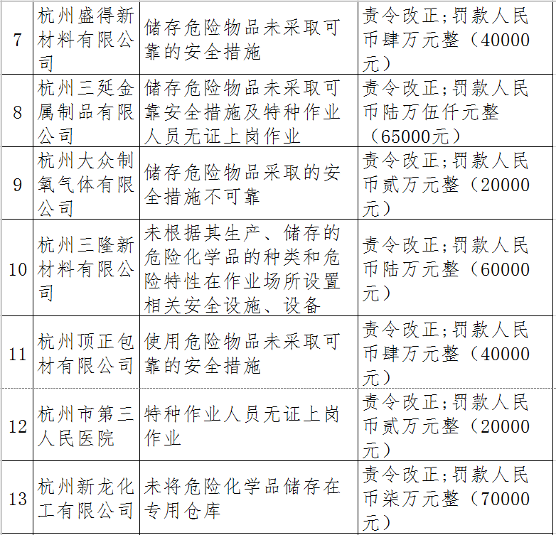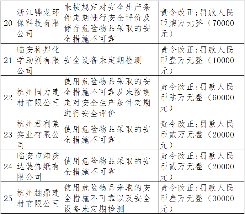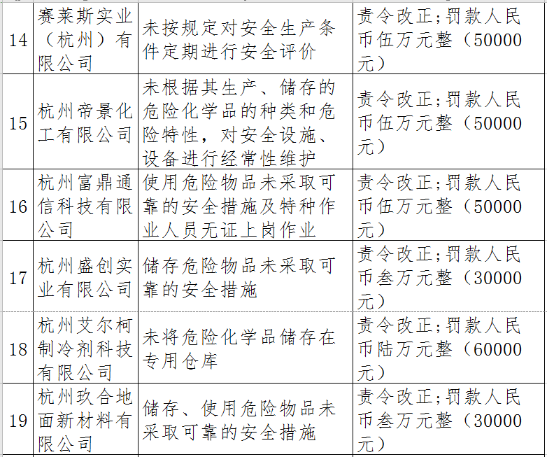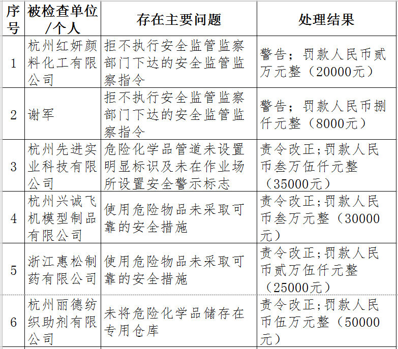 據(jù)了解,今年上半年,杭州市應(yīng)急管理局一手抓駐企復(fù)工復(fù)產(chǎn)、一手抓安全生產(chǎn),已完成年度執(zhí)法計(jì)劃、專項(xiàng)檢查、聯(lián)合執(zhí)法、信訪舉報(bào)核查等,并對(duì)檢查中發(fā)現(xiàn)的安全生產(chǎn)違法違規(guī)企業(yè)(個(gè)人)進(jìn)行了處罰?,F(xiàn)對(duì)52家被行政處罰的企業(yè)(個(gè)人)進(jìn)行曝光,希望各企業(yè)引以為戒!
