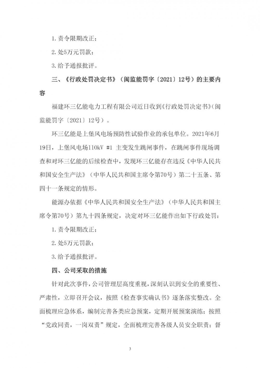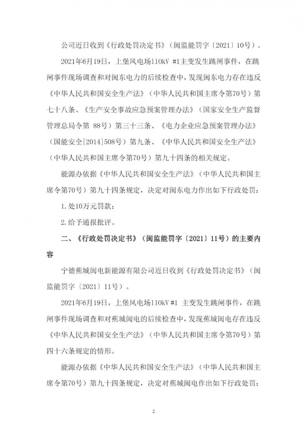 《公告》顯示,2021年6月19日,因上堡風(fēng)電場(chǎng)110kV#1主變發(fā)生跳閘事件,在跳閘事件現(xiàn)場(chǎng)調(diào)查和對(duì)閩東電力的后續(xù)檢查中,發(fā)現(xiàn)閩東電力、蕉城閩電、環(huán)三億能均存在違反相關(guān)法律條文的情況,分別處以10萬(wàn)元、5萬(wàn)元、5萬(wàn)元的罰款。