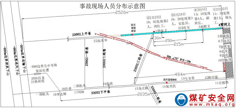 根據(jù)現(xiàn)場勘查和搶險救援報告認定:事故地點位于-810m 水平二采區(qū)南翼 2305S 工作面上平巷及三聯(lián)巷。