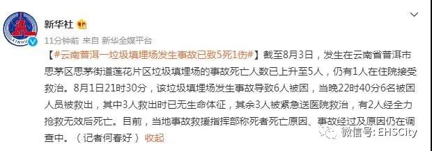【#云南普洱一垃圾填埋場發(fā)生事故已致5死1傷#】截至8月3日,發(fā)生在云南省普洱市思茅區(qū)思茅街道蓮花片區(qū)垃圾填埋場的事故死亡人數(shù)已上升至5人,仍有1人在住院接受救治。8月1日21時(shí)30分,該垃圾填埋場發(fā)生事故導(dǎo)致6人被困,當(dāng)晚22時(shí)40分6名被困人員被救出,其中3人救出時(shí)已無生命體征,其余3人被緊急送醫(yī)院救治,有2人經(jīng)全力搶救無效后死亡。目前,當(dāng)?shù)厥鹿示仍笓]部稱死者死亡原因、事故經(jīng)過及原因仍在調(diào)查中。(記者何春好)極目新聞?dòng)浾呤崂戆l(fā)現(xiàn),普洱市中心城區(qū)生活垃圾焚燒發(fā)電廠建設(shè)項(xiàng)目,為思茅區(qū)2019年23項(xiàng)重點(diǎn)工作之一,于2019年啟動(dòng)建設(shè),并優(yōu)先完成填埋區(qū)建設(shè)。2020年,普洱市相關(guān)領(lǐng)導(dǎo)曾前往思茅區(qū),實(shí)地調(diào)研市中心城區(qū)生活垃圾焚燒發(fā)電廠項(xiàng)目推進(jìn)工作。公開資料顯示,2020年3月,配套填埋場正式投入使用,填埋場類型為填埋生活垃圾的衛(wèi)生填埋場,庫容為30.1萬立方。