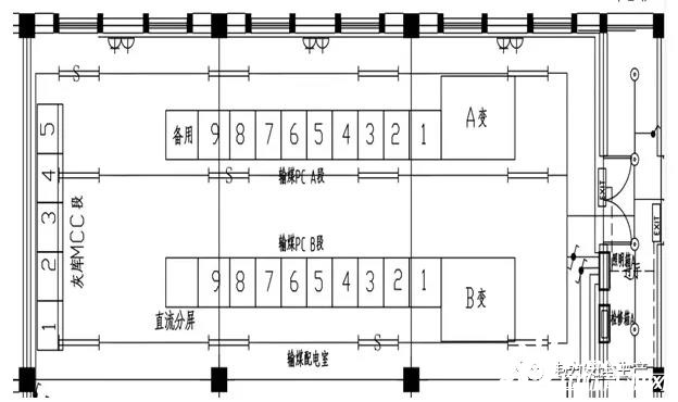 在輸煤配電室內(nèi),同時(shí)設(shè)計(jì)布置灰?guī)霢、B兩段MCC。兩段MCC各帶一個(gè)浪涌保護(hù)器,分別設(shè)置在兩段MCC進(jìn)線開(kāi)關(guān)側(cè)。400V灰?guī)霱CC開(kāi)關(guān)柜為MNS型開(kāi)關(guān)柜?;?guī)斓裙孟到y(tǒng)的建設(shè)為A標(biāo)段的工作內(nèi)容,天津公司負(fù)責(zé)灰?guī)霱CC安裝,天津公司分包給中某建設(shè)實(shí)施。輸煤系統(tǒng)和灰?guī)祀娫唇泳€圖見(jiàn)圖一;配電室俯視示意圖見(jiàn)圖二。