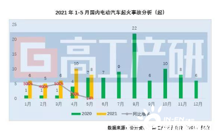 根據(jù)公告資料不完全統(tǒng)計,2021年1-5月國內(nèi)共發(fā)生電動汽車起火事故34起,較去年同期增加20起;涉及車輛數(shù)目38輛,較去年同期增長73%,隨著國內(nèi)電動汽車保有量的快速增長,起火事故備受業(yè)內(nèi)關(guān)注。