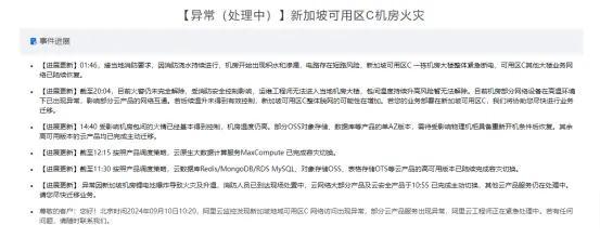 火災(zāi)公告顯示,11日凌晨01:46,接當(dāng)?shù)叵酪?,因消防澆水持續(xù)進(jìn)行,機(jī)房開始出現(xiàn)積水和滲漏,電路存在短路風(fēng)險,新加坡可用區(qū)C一棟機(jī)房大樓整體緊急斷電,可用區(qū)C其他大樓業(yè)務(wù)網(wǎng)絡(luò)已陸續(xù)恢復(fù)。